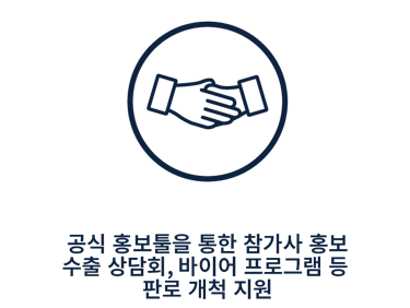 | 디렉토리 및 웹사이트 등재 | 부스벽면판넬, 회사명판, 카펫, 조명, 전기 1kW/콘센트 1개, 상담테이블 1개+의자 3개, 안내데스크 1개+스툴 1개, 휴지통 1개, 디렉토리 및 웹사이트 등재 |